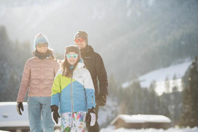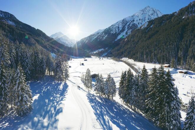 Direkt beim Parkplatz überqueren Sie die Brücke, um auf der gegenüberliegenden Bachseite in ca. 30 Minuten bis nach Volderau zu wandern. Alternativ kann die Tour auch von dort gestartet werden. Von Volderau führt der Winterwanderweg leicht ansteigend in ca. 45 Minuten bis nach Klaus Äuele bei Falbeson weiter. Queren Sie