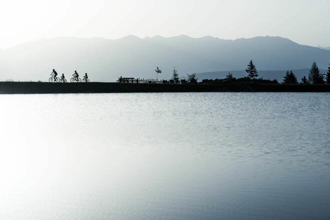 Die Talstation in Fulpmes ist Ausgangspunkt für diese Bike-Herausforderung. Nach wenigen Metern auf Asphalt heißt es auf dem Forstweg antreten und sich bis zur Mittelstation die Kraft gut einteilen. Die Steigung wird danach zwar kurz mäßiger, es sind aber noch ordentlich Höhenmeter zu absolvieren. Daher eine kleine Pause auf der Schlickeralm mit Blick auf die Kalkkögel einlegen und dann bis zum Bergrestaurant Kreuzjoch nochmals durchstarten. Ohne Wanderung zur Aussichtsplattform (15 min.) und Zwischenstopp bei der Abfahrt am Panoramasee sollte diese Tour nicht zu Ende gehen.