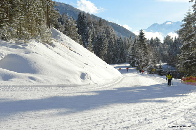 Loipe mit Panoramablick auf Hohe Munde und Wettersteingebirge entlang der Leutascher Ache.