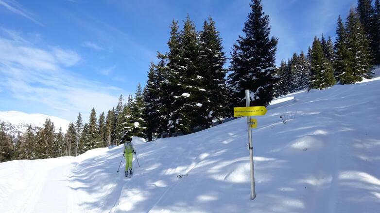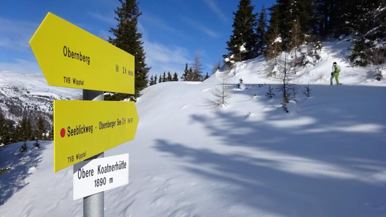 Vom Parkplatz folgen wir ein kurzes Stück der Rodelbahn, die vom Obernbergersee herunterzieht. Wir überqueren eine Brücke und erreichen die Wiesen der Unterreinsalm. Unmittelbar nach dieser Brücke wenden wir uns nach links (Osten) und steigen der Lichtung entlang empor. Am Ende der Lichtung geht es weiter durch den teilweise steilen und dichten Wald, was bei wenig Schnee mühsam sein kann, bis wir eine Forststraße erreichen (ca. 1700m). Dieser Forststraße folgen wir einige Minuten und gelangen zu einem Wegweiser: es geht weiter Richtung "Seeblickweg - Obernbergersee". Schon wenig später zweigt unsere Spur nach rechts ab und führt uns zuerst wieder über eine Lichtung, dann durch dichteren Wald höher, bis wir erneut auf die Forststraße treffen. Wir halten uns von nun an an den breiten Rücken, der aufwärts zieht, und haben schon bald die letzten Bäume hinter uns gelassen, Der häufig abgeblasene Rücken wird flacher und führt nach Süden zum höchsten Punkt, den ein Steinmann ziert. Das Gipfelkreuz ereichen wir indem wir dem Gratrücken noch ein paar Minuten nach Süden folgen.