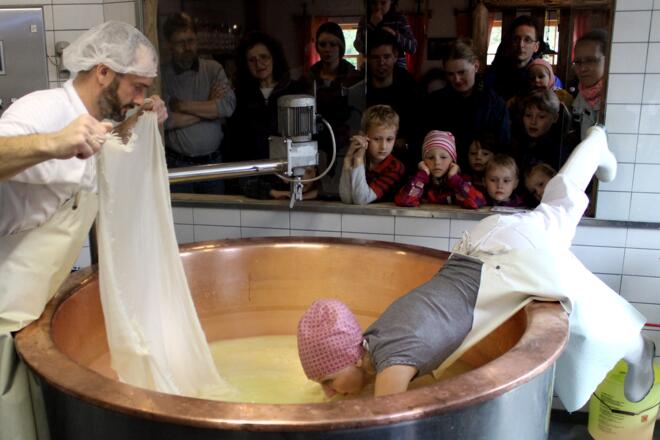 Die hofeigenen Produkte wie Quark, Milch, Butter, Streuobst-Apfelsaft sowie die Produkte der Landzunge werden gerne gekauft und gekostet. Die Älperlin Gundi ist Sennerin mit Leib und Seele. Gerne zeigt und erläutert sie ihren Gästen die Philosopie ihrer Biokäserei.