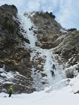 Steiler Eisklassiker in alpiner Umgebung. Mit 4 Seillängen recht lohnend.