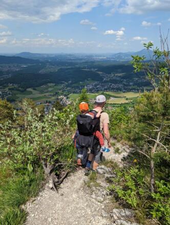 Von nun geht es immer steiler bergauf. Kurz vor dem Dötzenkopf-Gipfel wird es flesiger und alpiner, Trittsicherheit ist hier unbedingt geboten. Die Strecke ist nicht einfach aber kurzweilig und durchaus attraktiv - auch für Kinder. Die vier Bänke auf dem Gipfel laden zu einer gemütlichen Brotzeit ein, während ihr von Schmetterlingen umflattert werdet und einen grandiosen Ausblick genießt.