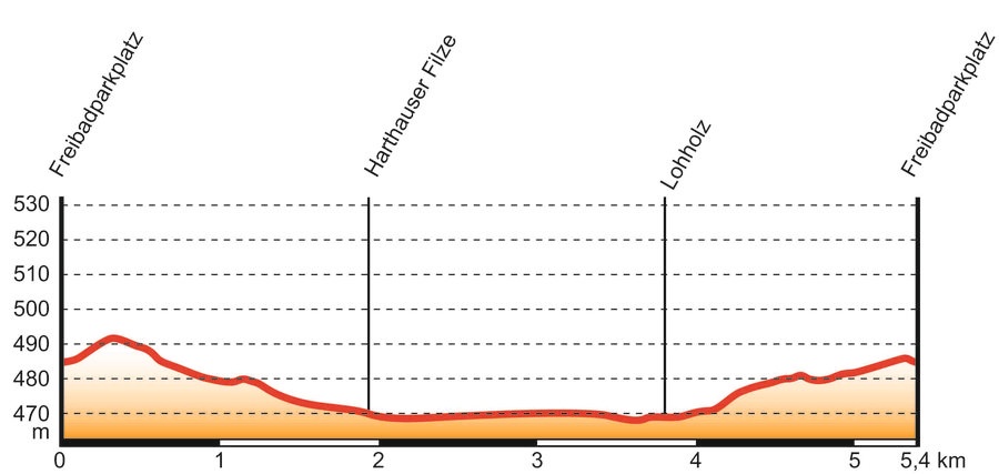 Rundstrecke ab der Starttafel am Freibadparkplatz in Harthausen über den Nordic Walking Park am Gereuthweg zur Asphaltstockbahn in Waschbrunn, durch die Harthauser Filze, vorbei am Schützenheim in Lohholz (an der Aiblinger Straße) zurück über den Kühlbrandweg an den Weihern vorbei zum Freibadparkplatz Harthausen.