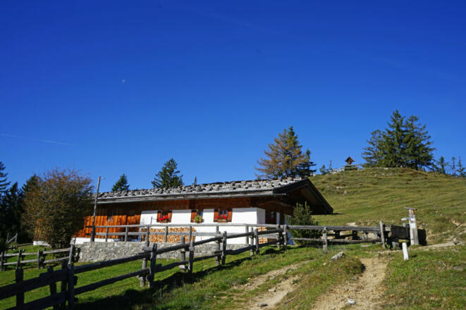 Nach der Rast führt ein schmaler Fußweg durch das zunächst noch freie Almgelände erst recht flach, dann steiler empor nach Norden. Immer den roten Markierungen folgend erreicht man bald lichten Bergwald. Weiter wunderschön entlang des mit vitalem Mischwald bewachsenen Bergrückens nach Norden in wechselnder Steigung bergan. An einem kleinen Waldsattel treffen wir auf einen Wegweiser. Hier gut aufpassen: Nicht links dem Schild Ri. "Hochplatte" folgen, sondern weiter geradeaus und unbeschildert. Dieser, mit blauen Punkten markierte Steig ist der direkte Aufstieg auf die Hochplatte. Teils direkt auf der Kammlinie, teils auf deren Westseite gewinnt man über den wenig ausgetretenen Steig an Höhe, wobei man gut auf die Markierungen achten muss. Schließlich verlässt der Weg den Waldbereich und führt durch die Latschenzone zuletzt etwas flacher direkt auf die Hochplatte.