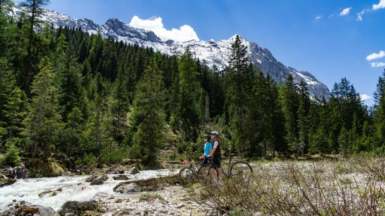 Tipp: An heißen Sommertagen kann man sich vor, während und nach der Tour an der Leutascher Ache abkühlen. Bis zum Ende des Leutaschtals hat man immer wieder Zugang zu ihrem herrlichen Ufer. In Scharnitz kann man sich an die Isar setzen und die Füße ins eiskalte Wasser halten.