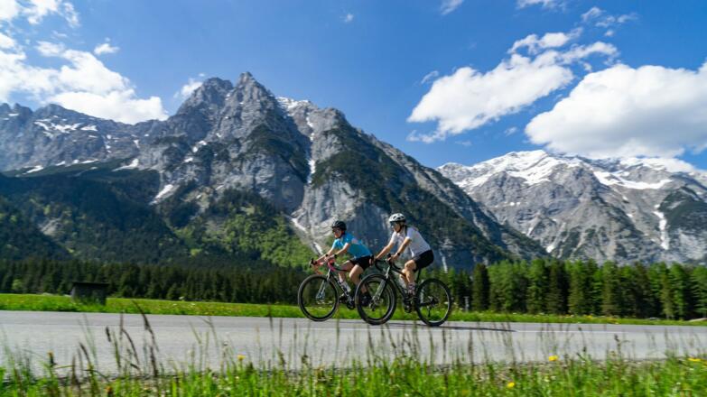 Mit dem Mountainbike oder dem Gravelbike rund um die Arnspitzen (Strecke AR): eine weitläufige Genussfahrt durch landschaftlich großartige Kulissen. Die Tour führt über schönste Wege durch das sonnige Leutaschtal, entlang der wunderschönen Leutascher Ache bis nach Deutschland und wieder zurück nach Scharnitz und Seefeld am Fuße des Karwendelgebirges. Dabei sind die schönsten Blicke auf die umliegenden Berge garantiert.