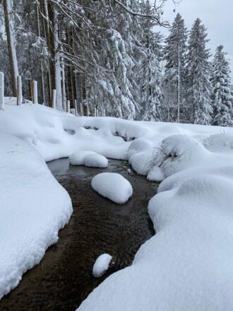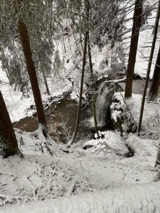 Wunderschöne Schneeschuhtour in wundervoller, abwechslungsreicher Landschaft mit sanften Anstiegen, ideal zum Schneeschuhlaufen für Einsteiger - über das Hellengerster Hochmoor entlang der ehemaligen Bahnlinie Hellengerst-Isny bis zum Wasserfall (ehemalige Tobelmühle / Sägemühle) durch Wald und über Wiesen.