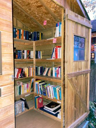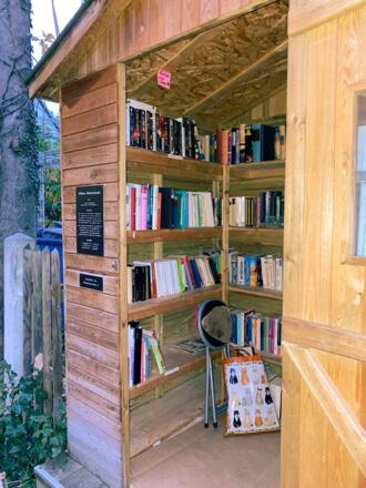 Ein kleines Gartenhäuschen voller Bücher für Kinder und Erwachsene.