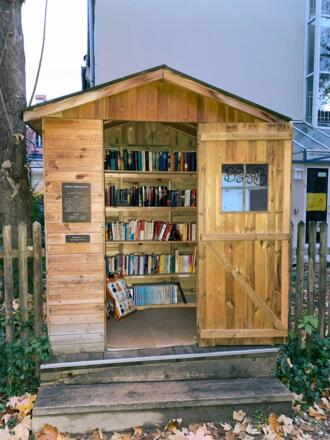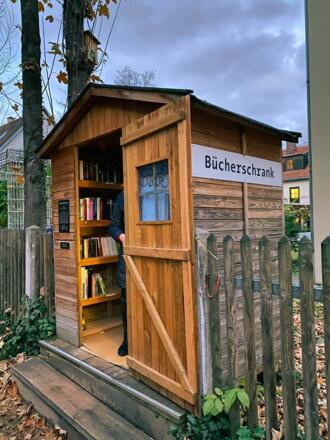 Das kleine Holzhäuschen wurde durch die Seniorenvertretung Au/Haidhausen initiiert und gebaut. Bis heute kümmern sich die Mitglieder selbst um die Sauberkeit in der kleinen „Bücherei“.