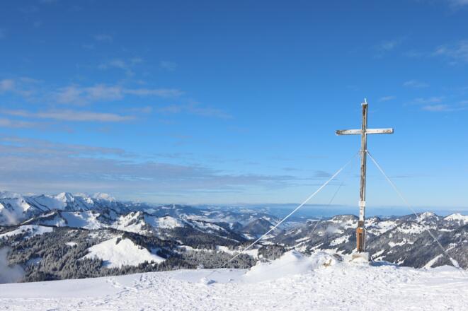 Das Riedberger Horn ist wohl der bekannteste Berg im Naturpark Nagelfluhkette. Die einzeln stehende Pyramide ragt rund 1787 Meter in die Höhe und bietet damit ringsum freie Sicht in die Hochalpen und bis zum Bodensee.