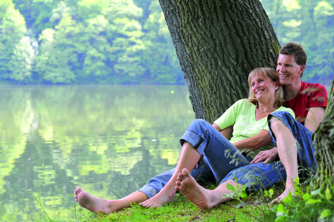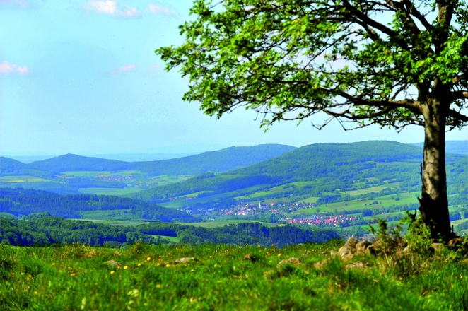 Die Bernshäuser Kutte ist ein geologischer Erdfallsee. Weiter zur Roßdorfer Landwehr und über den neuen Aussichtsturm auf der Pleß hinunter nach Bad Salzungen an der Werra.