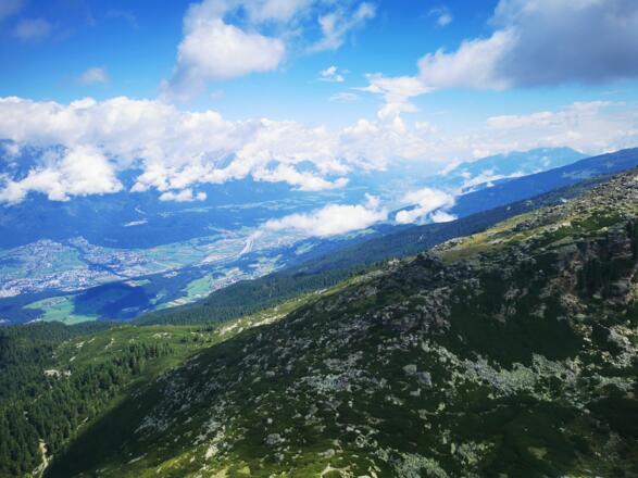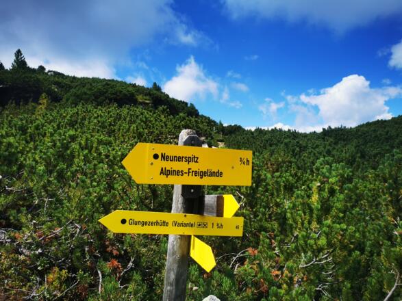 Nach Aufstieg mit der Glungezerbahn geht es westwärts ca. 30min entlang des Zirbenweges. Unterhalb der Neunerspitze weist ein Schild Richtung Süden bergauf. Nach ca. 45min hat man die Neunerspitze erreicht. Der Blick reicht weit über das Inntal und hinüber in das Karwendel.
