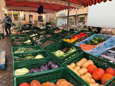 Am grünen Wochenmarkt werden saisonale Produkte angeboten.