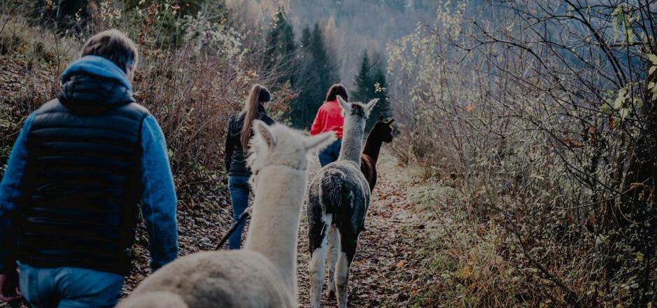 Alpakaspazierer werden bei der Ankunft von Karin und Christian empfangen und zu den Alpakas begleitet. Die beiden erzählen wissenswertes über die Neuweltkameliden und interessantes über den Hofalltag.
