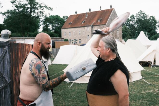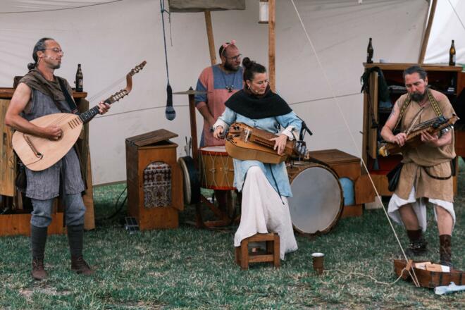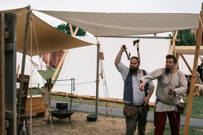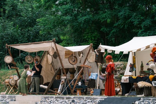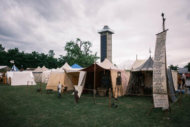 🗡 Authentische Lagergruppen geben einen eindrucksvollen Einblick in das mittelalterliche Alltagsleben auf Reisen, da wird am offenen Feuer gekocht, unterm Baldachin getafelt und der interessierte Passant, sofern er sich artig vorzustellen weiß, in die Geheimnisse mittelalterlichen Speisenzubereitung eingeweiht.