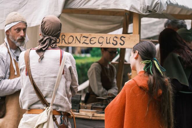 🗡 Versierte Handwerker zeigen ihr Können an Drechselbank, Esse, Spinnrad, Filztisch oder Webstuhl, ja selbst einem Glockengießer kann man über die Schulter ins flüssige Metall schauen, bei seinem Tun beobachten und zu seiner Kunst befragen.