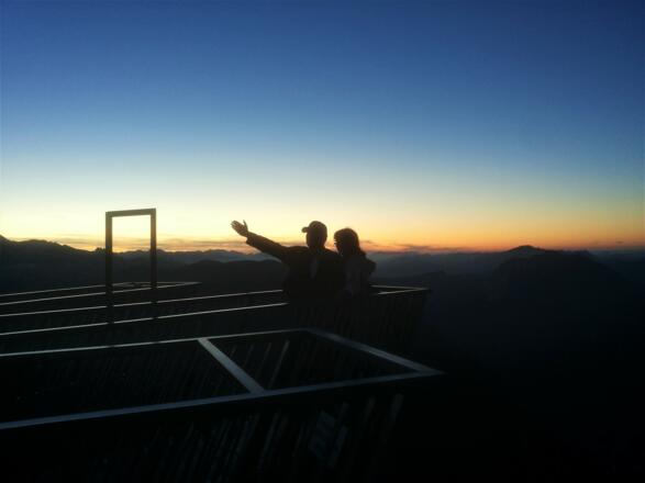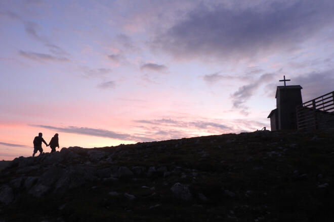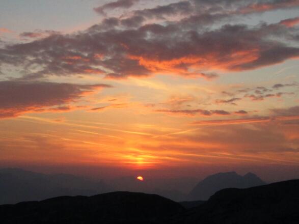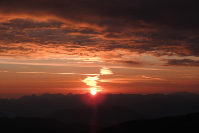 Auf geht's und die Seilbahngondel schwebt langsam in die Höhe. Am Horizont Berggipfel an Berggipfel gereiht, schemenhaft in glühendes Rot getaucht. Angekommen auf 2 100 m, fragt man sich, wozu es das Wort Morgengrauen gibt. Es ist ein Morgenrot in all seinen Schattierungen und es wird stärker und heller, bis aus den leuchtenden Farben die Sonne als roter Feuerball aufsteigt. Der Anblick der Sonne ist in diesem Moment so stark, dass man ihn auch mit geschlossenen Augen wahrnimmt. Wendet man der Sonne nun den Rücken zu und blickt Richtung Dachstein, dann ist dieser Ausblick mindestens genauso beeindruckend. Stück um Stück wird der Dachsteingipfel, der Gletscher, die Dirndln, der Koppenkarstein und alle anderen Gipfel in sanftes Licht getaucht. Ein neuer Tag ist erwacht, eine Schäfchenwolke wandert schimmernd über das Gipfelmassiv, hinterher ihr kleiner Schatten.