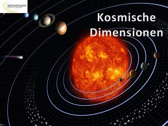 "Kosmische Dimensionen" illustriert die beeindruckenden Weiten des Weltalls und versucht mit vertrauten Dingen aus dem Alltag diese Größen fassbar zu machen.