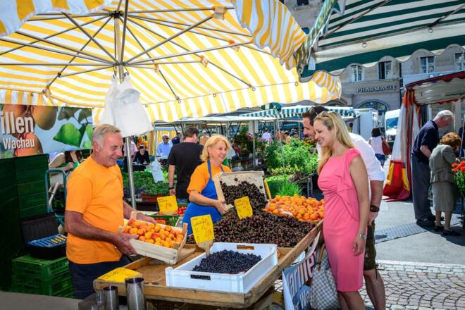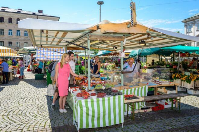 Seit 1906 gibt es den „Wochenmarkt für Landesprodukte“ auf dem Vorplatz der St. Andräkirche. Neben dem Nasch- und Brunnenmarkt in Wien zählt der Salzburger Wochenmarkt zu den größten und bekanntesten Märkten Österreichs. Ab 5.00 Uhr morgens bieten Landwirte und Gastronomen frische und qualitativ hochwertige Spezialitäten zum fairen Preis. Während im Sommer Blumen und Pflanzen sehr gefragt sind, gehen im Winter Adventkränze und zu Ostern die traditionellen Palmbuschen über die Theken der rund 190 Stände. Wer es lieber kulinarisch mag, dem ist ein deftiges Backhendl, eine klare Fischsuppe oder ein typischer Salzburger Imbiss vom Würstelstand zu empfehlen.