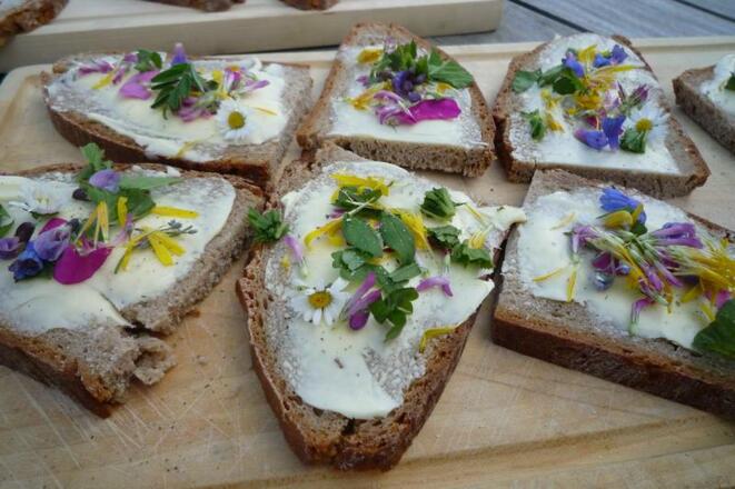 Zum Abschluss machen wir uns aus den gesammelten Wildkräutern ein schmackhaftes Blüten- Aufstrich Brot mit einem Kräutersaft.
