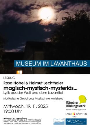 Unter dem Titel magisch–mystisch–mysteriös gestalten Rosa Hobel und Helmut Lechthaler eine Lesung, die das Publikum mit Lyrik aus der Welt und dem Lavanttal in ihren Bann ziehen wird.