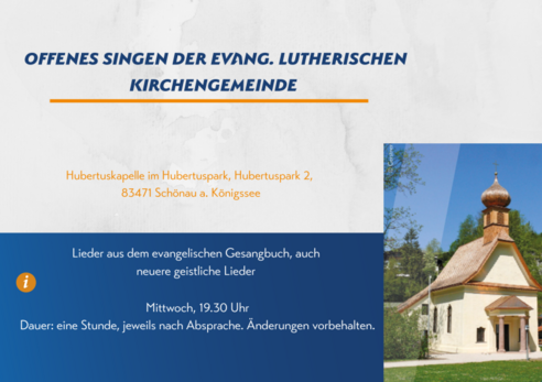Wir singen Lieder aus dem evangelischen Gesangbuch, auch neuere geistliche Lieder und sind offen für Wünsche und Anregungen.Mittwoch, 19.30 Uhr, Hubertuskapelle SchönauDauer: eine Stunde, jeweils nach Absprache. Änderungen vorbehalten.