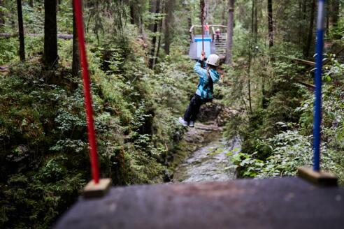 Was sich so gefährlich anhört, wird durch die perfekte Sicherung von Profis mit Klettergurten zum risikofreien Abenteuerspaß.