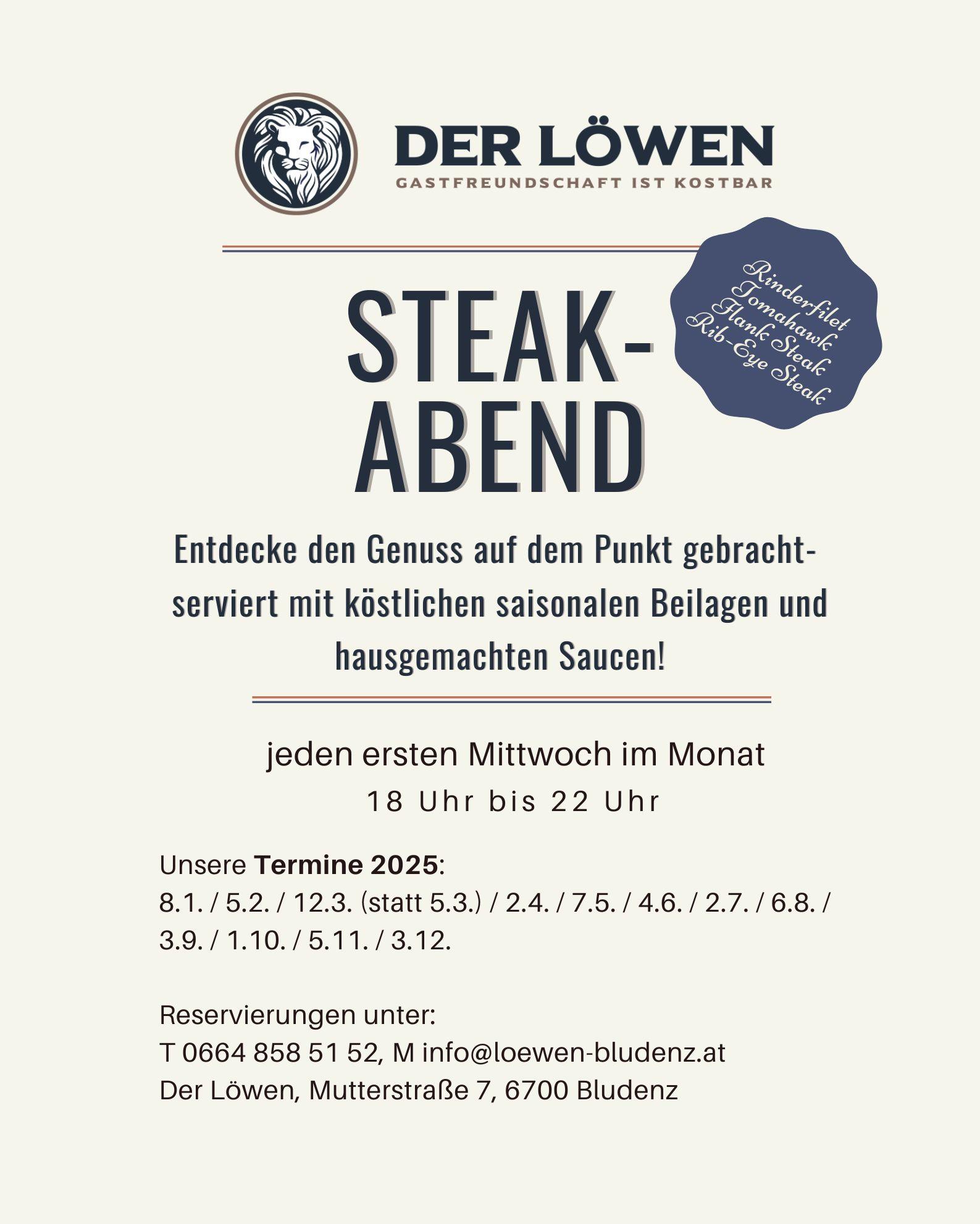 Entdecke den Genuss auf den Punkt gebracht! Jeden ersten Mittwoch im Monat ist Steakabend bei uns! Erlebt eine Gaumenfreude mit Rinderfilet, T-Bone, Tomahawk, Rib-Eye Steak, oder Surf and Turf, begleitet von saisonalen Beilagen und hausgemachten Saucen. Unsere Auswahl an feinen Weinen ergänzt das kulinarische Erlebnis.