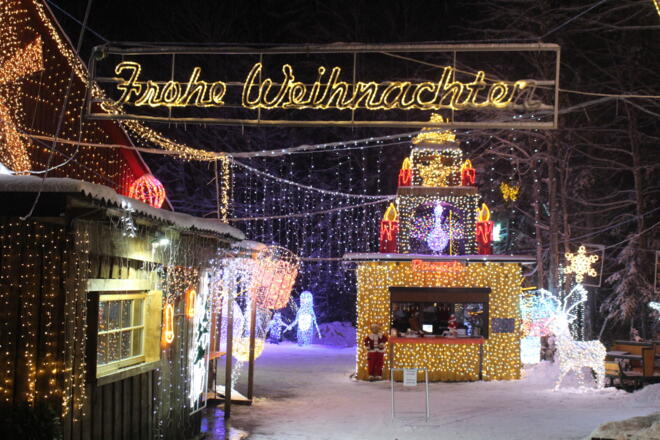 Vielleicht wird auch dein Wunsch wahr. Schau dir die funkelnden Lichter und Figuren an und lass dich erleuchten vom Lichtermeer rund um das Weihnachtshaus vom Weihnachtsmann.
