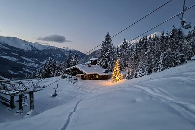 Vor der Alm erwartet die Gäste ein warmer Aperitiv und ein grandioser Blick über Gastein.