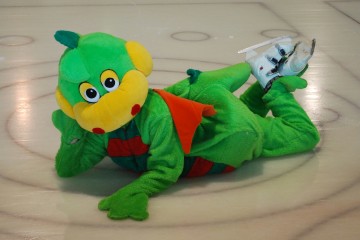 Drache Sebastian von der Linzer Grottenbahn saust übers Eis und verteilt kleine Überraschungen an alle Kinder.