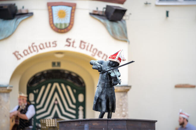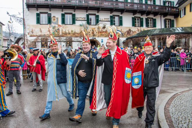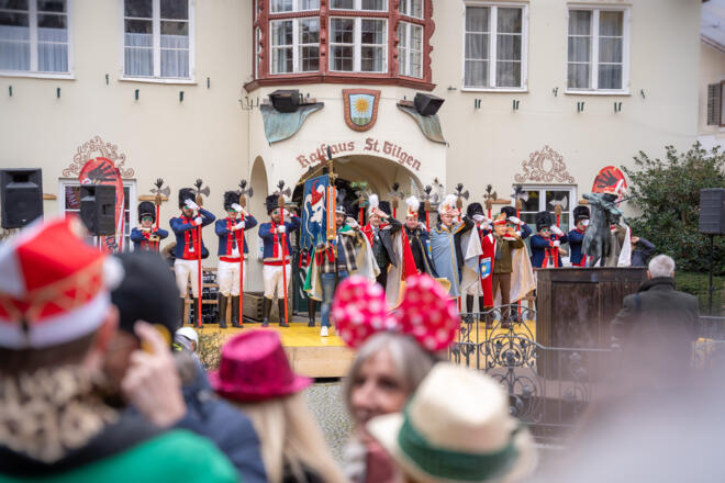 Bühnenfasching und Umzug der St. Gilgener Narren am Mozartplatz.