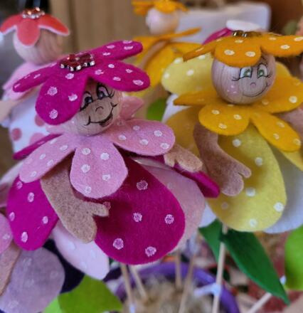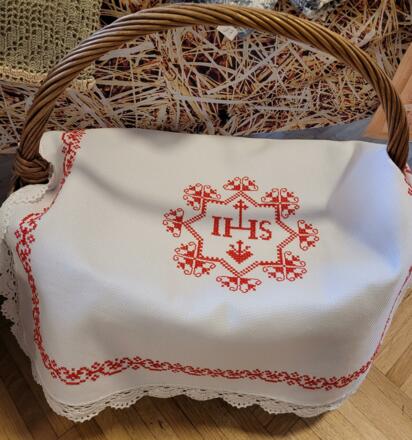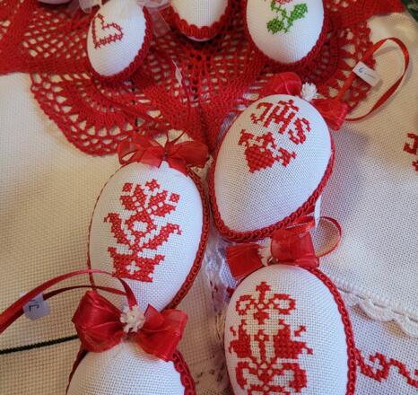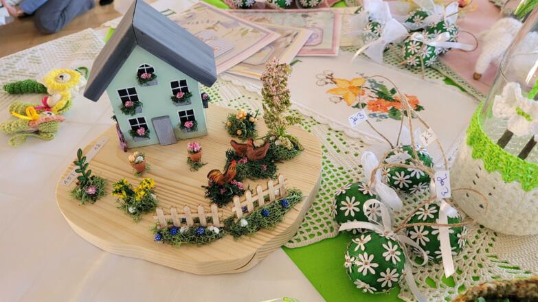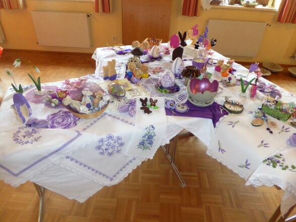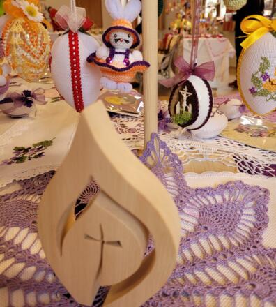 Auf den Tischen finden sich kleine und größere Handarbeiten, liebevolle Basteleien und typische Dinge für die Osterzeit. Besonders gefragt sind die Palmbuschen für den Palmsonntag. Auch Weihkorbdecken gehören zum Angebot und erinnern an alte Bräuche rund um das Osterfest.