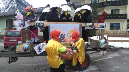 Von dem Gemeindeplatz aus und begleitet von der Ortmusikkapelle Obertraun, ziehen die kleinen Faschingsnarren mit ihren tollen Kostümen durch den Ort.