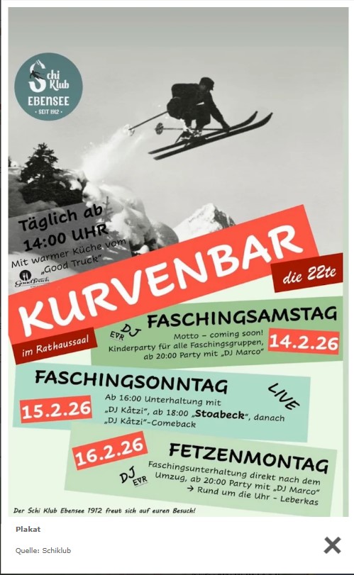 Die KURVENBAR ist ein Fixpunkt im Ebenseer Fasching, ein Treffpunkt für Spaß und Unterhaltung, organisiert vom Schiklub Ebensee.