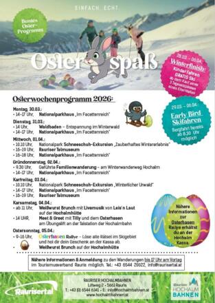 Die Rauriser Hochalmbahnen lädt alle Kinder des Raurisertals herzlich zu der Osterhasen Rallye im Skigebiet der Hochalmbahnen ein. Dann hol dir deinen Plan an der Kassa der Rauriser Hochalmbahnen, löse alle Rätsel im Skigebiet und hol dir zum Schluss dein Geschenk an Kassa ab.