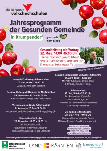 Der Frühling steht vor der Tür und mit ihm die perfekte Gelegenheit, um frische Energie zu tanken und gesunde Gewohnheiten zu etablieren. In Zusammenarbeit mit der Gemeinde Krumpendorf und mit Unterstützung des Gesundheitslandes Kärnten freuen wir uns, Ihnen ein breites Spektrum an Kursen anbieten zu können, um Sie dabei zu unterstützen, fit und gesund in die warme Jahreszeit zu starten!