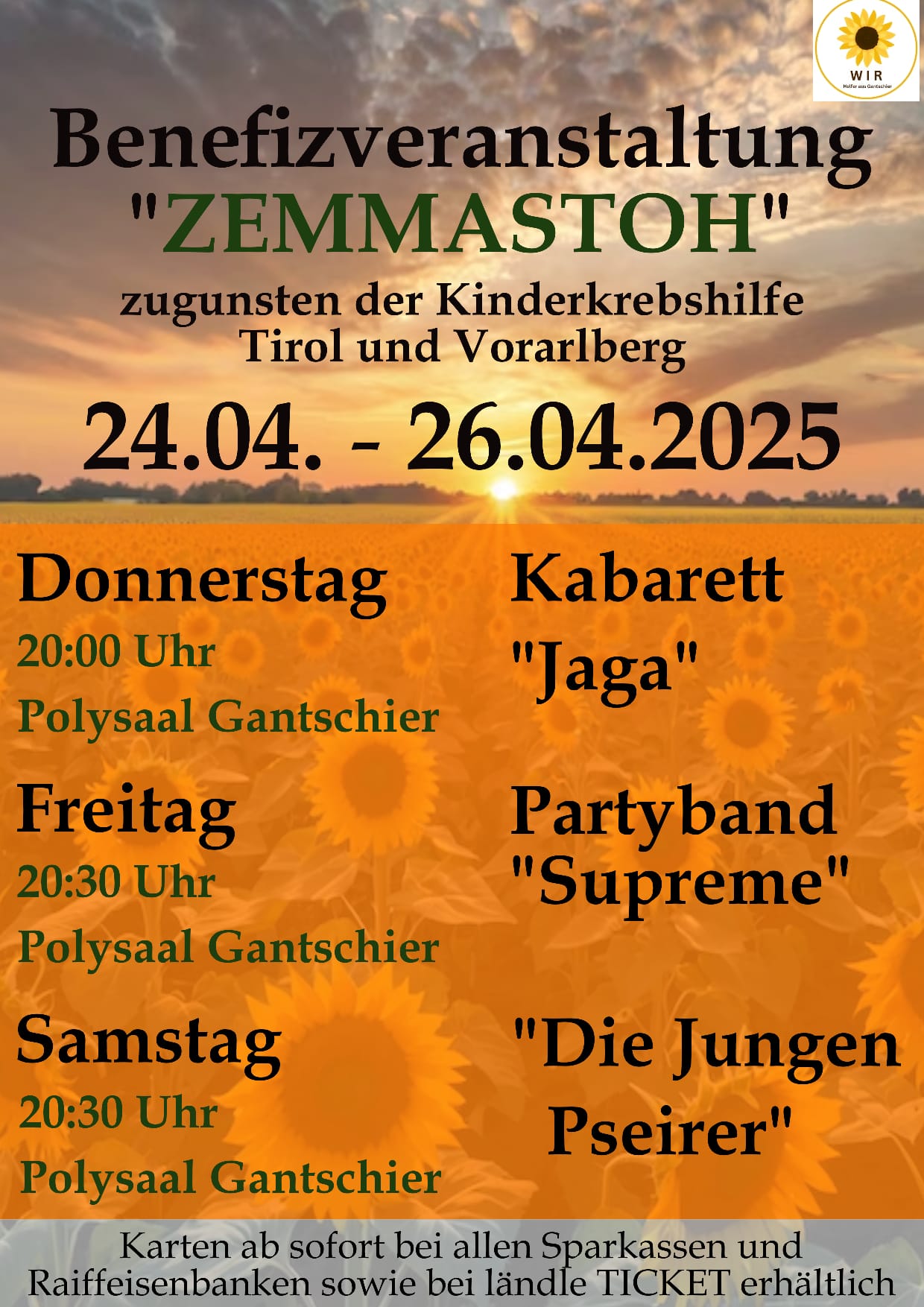 Die Benefizveranstaltung "Zemmastoh" im Polysaal Gantschier unterstützt die Kinderkrebshilfe Tirol und Vorarlberg. An drei Abenden erwartet Dich ein abwechslungsreiches Programm: Am Donnerstag tritt das Kabarett "Jaga" auf, gefolgt von der Partyband "Supreme" am Freitag. Den Abschluss bildet am Samstag ein Auftritt von "Die Jungen Pseirer".