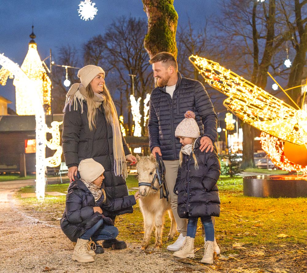 Im winterlich-zauberhaften Pollheimerpark erleben die jungen Besucher spaßige Karussellfahrten, können Ponys streicheln und eine kleine Runde durch den Park reiten.