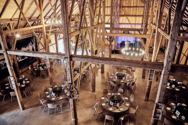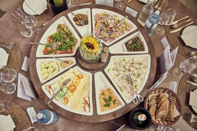 Die Idee ist simpel: Die Gerichte – von der Suppe bis zum Knödel – werden in den eigens kreierten Wagenrädern direkt am Tisch serviert. Dort kann sich jede und jeder nach Belieben bedienen. Gespeist wird auf runden 10er-Tischen, die je nach Reservierung nach und nach gefüllt werden. Natürlich können auch ganze Tische reserviert werden.