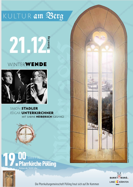 Edgar Unterkirchner, musikalischer Gastgeber lädt zur Wintersonnenwende zwei besondere und spannende Gäste zum gemeinsamen Musizieren ein: Der bei Konstantin Weckers Label unter Vertrag stehende, aufstrebende junge Musiker Simon Stadler hat sich nicht nur als Sänger sondern auch als Pianist einen Namen gemacht. Eigenkompositionen und ein ausgewähltes Programm rund um den Winterbeginn und gleichzeitig wieder länger werdende Tage runden das Kultur am Berg – Jahr 2025 in der Pfarrkirche Pölling stimmig ab. Als besonderen Gast begrüßen die beiden Sängerin Sabine Neibersch, die sich (nicht nur) als Musical-Sängerin international einen großen Namen ersungen hat.