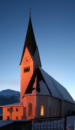 Traditionelles Turmblasen, gestaltet von einer Gruppe der Trachtenmusikkapelle Uttendorf, nach dem Abendgottesdienst vom Kirchturm.