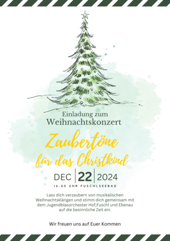 Lass dich verzauber von musikalischen Weihnachtsklängen und stimm dich gemeinsam mit dem Jugendblasorchester Hof, Fuschl und Ebenau auf die besinnliche Zeit ein. Wir freuen uns auf Euer Kommen! Eintritt frei!