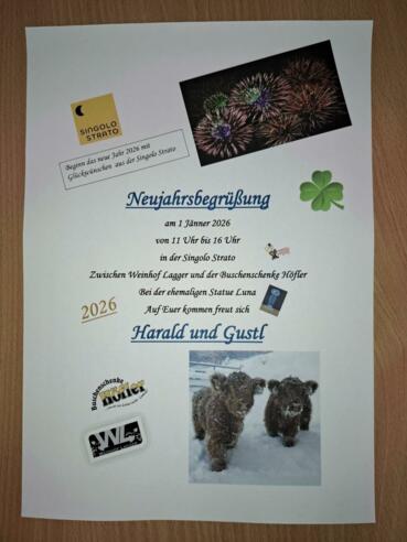 Beginn das neue Jahr 2026 mit Glückwünschen in der "Singolo strato". Zwischen Weinhof Lagger und der Buschenschenke Höfler - bei der Statue Luna.