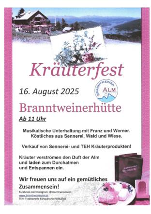 Mit musikalischer Unterhaltung, Köstliches aus Wald und Wiese, Verkauf von Kräuterprodukten, Kräuter verströmen den Duft der Alm und laden zum Durchatmen und Entspannen ein.