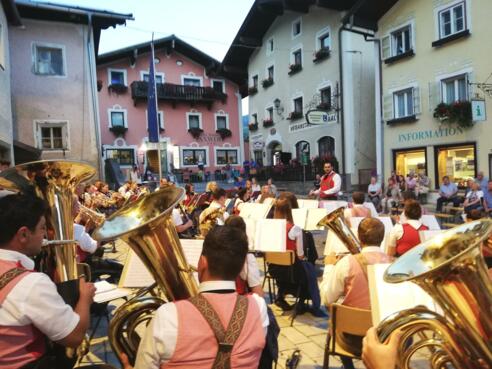 Sommerkonzert der Trachtenmusikkapelle Taxenbach vor der Marktgemeinde Taxenbach mit der Taxenbacher Schnalzergruppe.