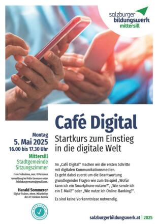 Im "Café Digital" machen wir die ersten Schritte mit digitalen Kommunikationsmedien. Es geht dabei zuerst um die Beantwortung grundlegender Fragen wie zum Beispiel "Wofür kann ich ein Smartphone nutzen?", "Wie sende ich eine E-Mail?" oder "Wie nutze ich Online-Banking?".