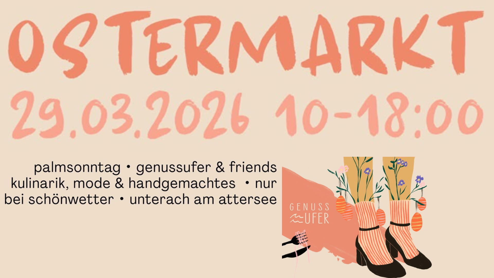 Am 29. März laden wir euch herzlich zu unserem Ostermarkt im und rund um das Genussufer ein! Euch erwartet eine wunderbare Auswahl an Speisen, perfekt zum Durchprobieren und Genießen. Stöbert durch ausgewählte Verkaufsstände mit Mode, Wohnaccessoires und feinen Süßigkeiten.