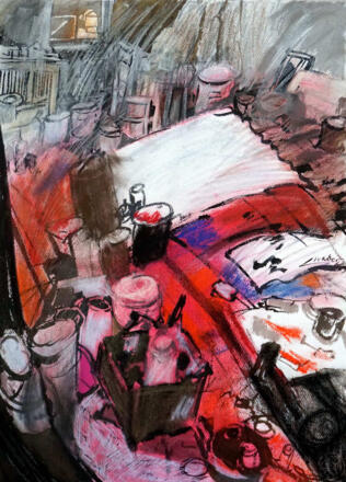 Viele der von Waber besuchten Künstler:innen sind auch in der Sammlung Angerlehner vertreten, weshalb den Atelieransichten Werke der respektiven Künstler:innen aus der Sammlung gegenüber gestellt werden. In spannungsvollen Kontrast zu den Atelierzeichnungen stehen dabei neue, nie gezeigte, großformatige grafische Blätter, die Interieurs, aber auch Reisemotive zum Inhalt haben und die ungebrochene expressive Kraft der Künstlerin eindrucksvoll veranschaulichen.